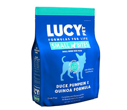 Lucy Pet Foods™ 鴨、南瓜和藜麥小咬狗糧配方含有適合小型犬的營養。Lucy Pet Formulas for Life™ 改善腸道健康,支持健康的免疫系統、心臟健康、皮膚和皮毛等等!